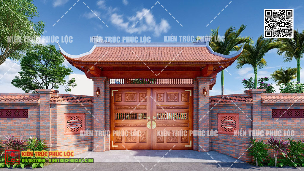 • Cổng nhà gỗ cổ truyền được làm theo kiểu hai mái đẹp, với phần trụ cổng được xây gạch trát vừa bê tông. Cánh cổng gỗ 2 cánh, với các phần khung song tuy tối giản nhưng đẹp mắt. Tạo nên tính thẩm cao cho công trình nhà gỗ kẻ truyền.