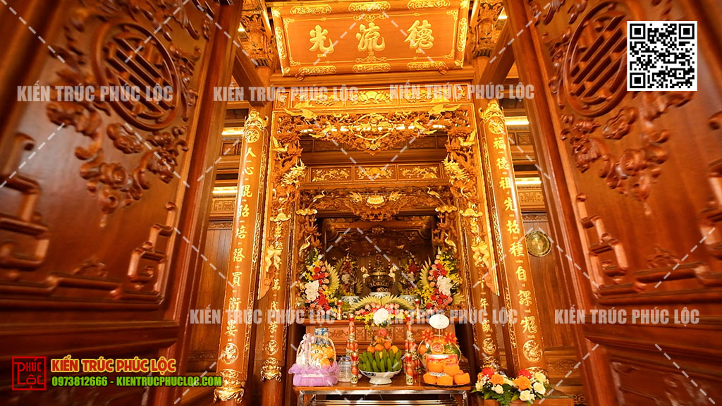 Hậu cung phía sau là không gian riêng biệt, dùng để đặt bàn thờ chính, tạo sự tôn nghiêm và kín đáo cho việc thờ tự tổ tiên.